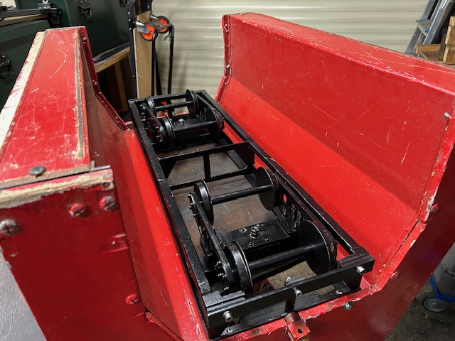 Tony, Howard and the Raised Track Guard Trucks The self-steering bogies had been subject to wear, significant modification and had met their demise. With the trucks out of use we agreed to try to revive them. Firstly, the green truck was returned to service with minor modification to the running gear to prevent the body from grounding. This has been reasonably successful and we turned our attention to the red truck – modifying in a similar way with springs and rubber suspension spacers. This has not been totally successful with such a long wheelbase and the decision was taken to fit bogies. The chassis was modified significantly to make room and the bogies fitted. The truck has been tested and is available to use. When this has run in and proves good, we plan to finish it off (paintwork etc.) and then fit the green truck with bogies. HERE |